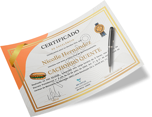 Após finalizar seu Curso você terá acesso a um certificado de conclusão, direto na sua área exclusiva de aluno, atestando a sua capacitação no Curso de Cachorro Quente Gourmet
